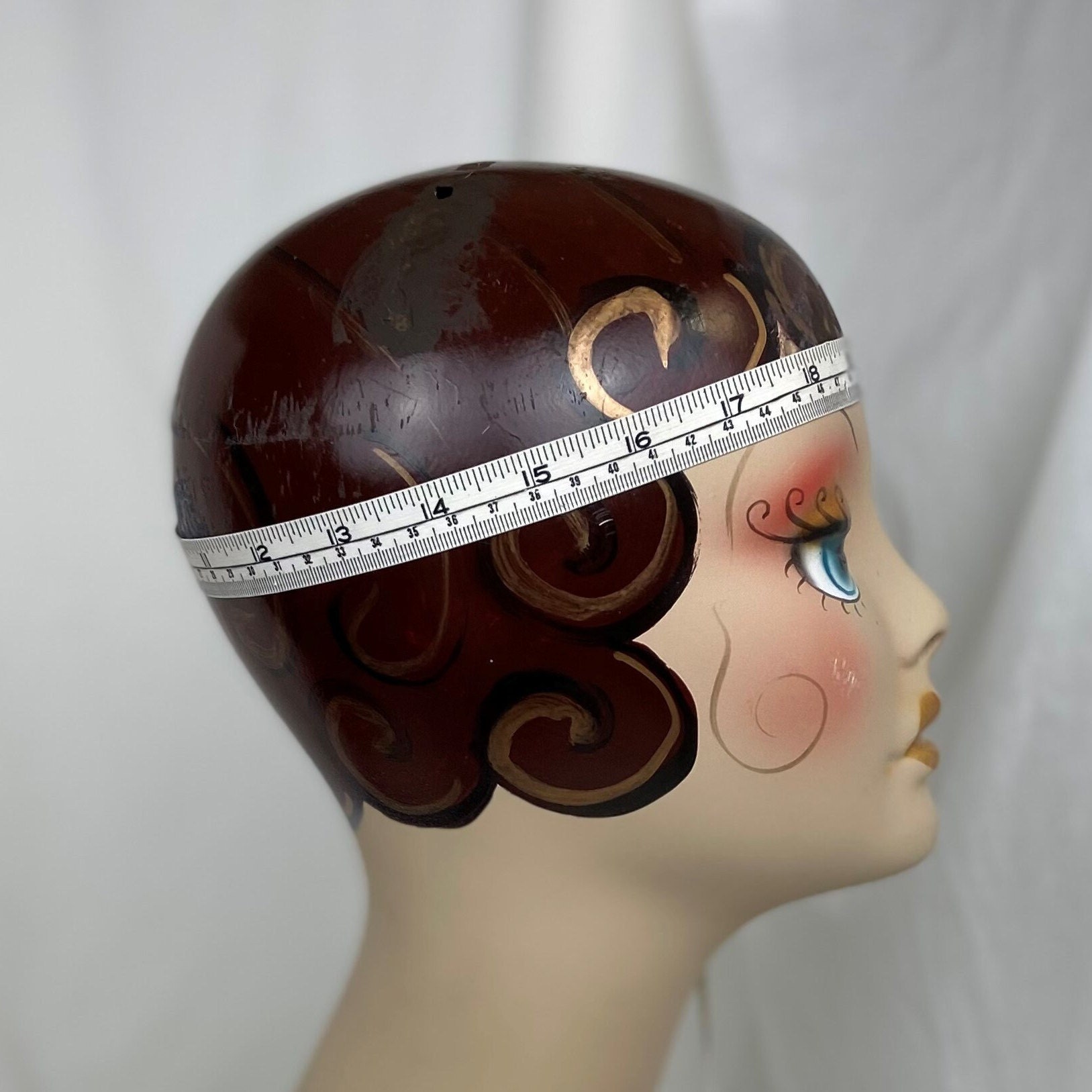 It measures approximately 4" at the highest point, 2" in the back and will fit head sizes 22-22.5.