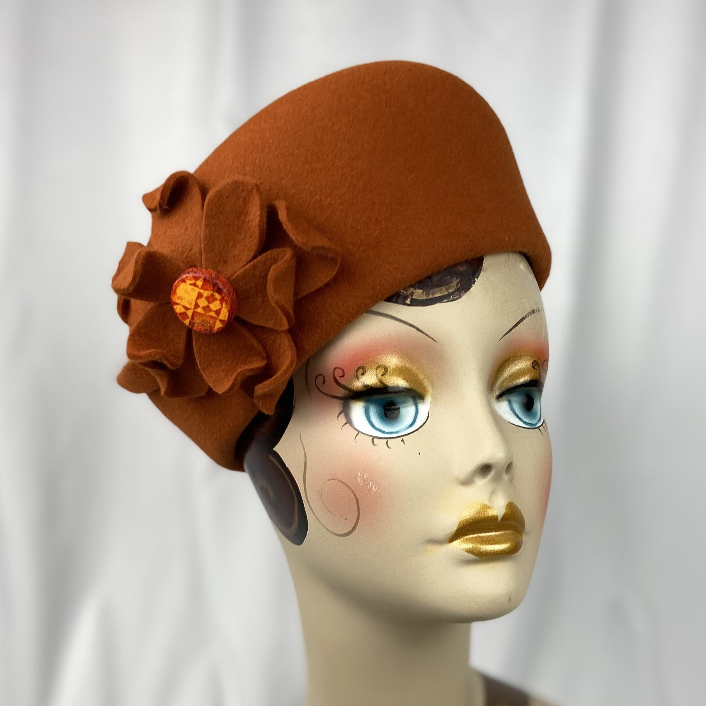 This hat in rust, velour felt was handmade on one of my vintage hat blocks. It's simple but luxurious. I added a single feltwork flower of matching felt as trim. The look is reminiscent of the 1940's- 1960's.