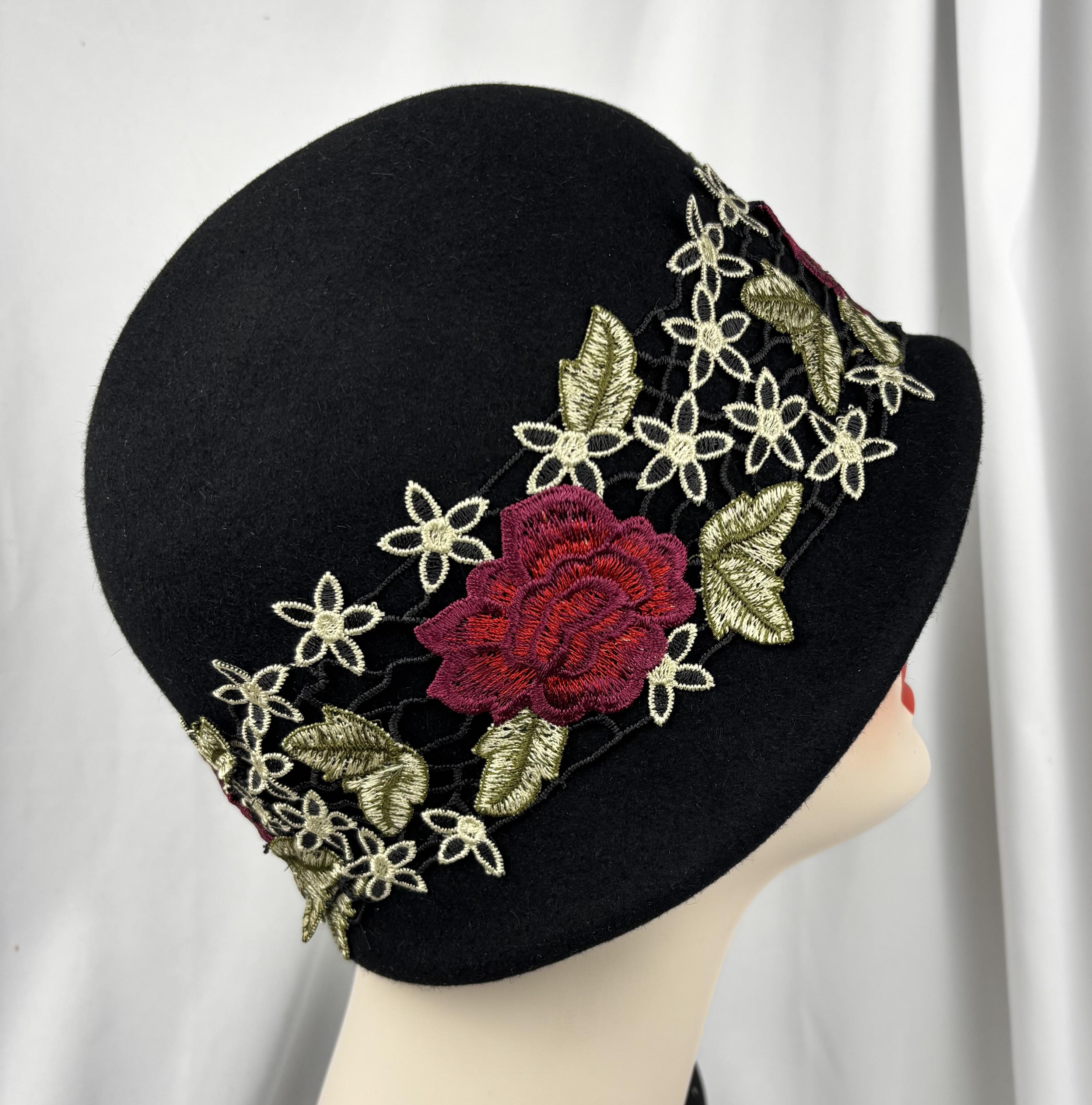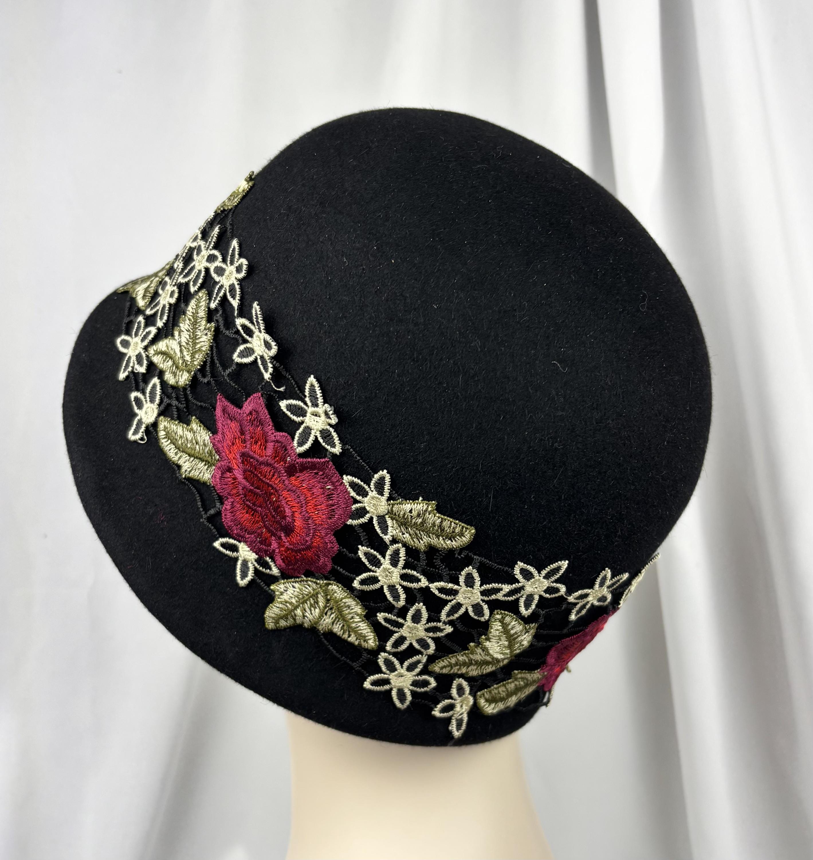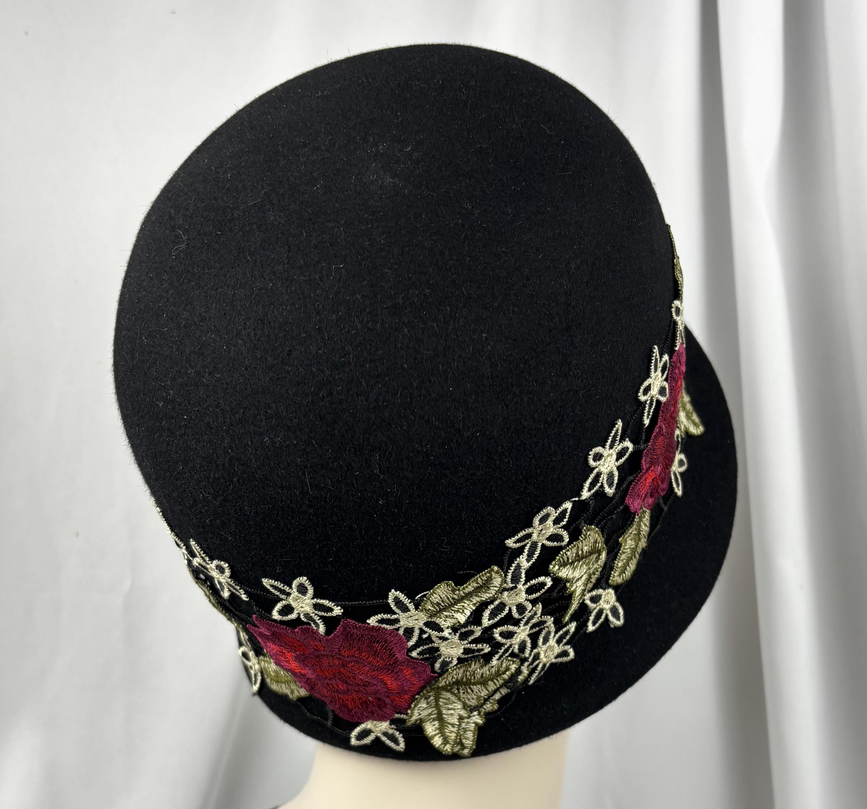 Black Felt Cloche, Embroidered Trim, 1920s Style, Handmade Millinery
