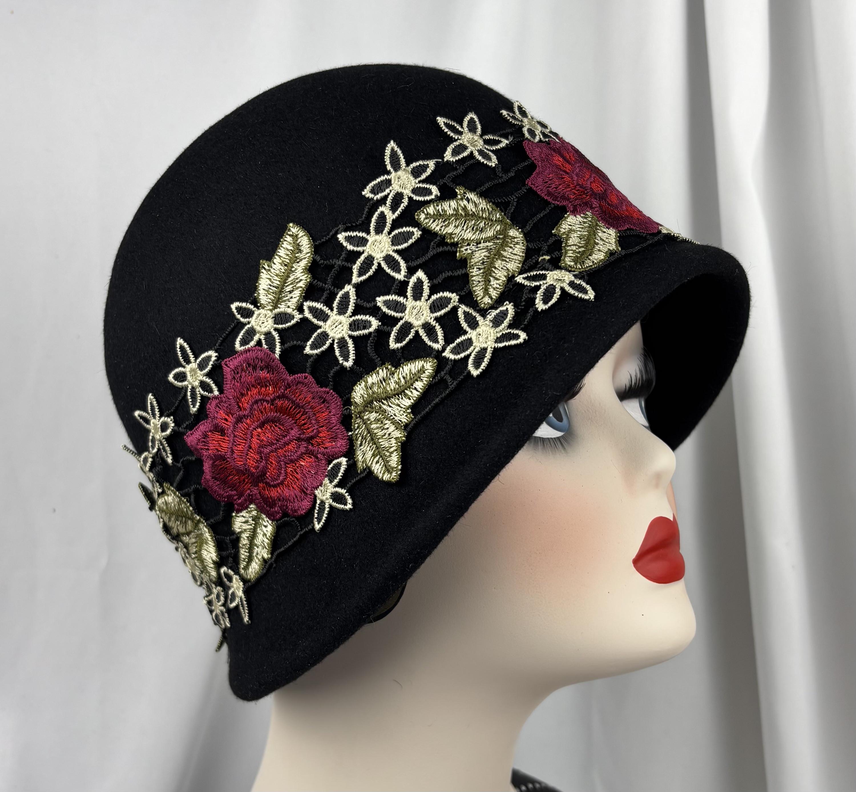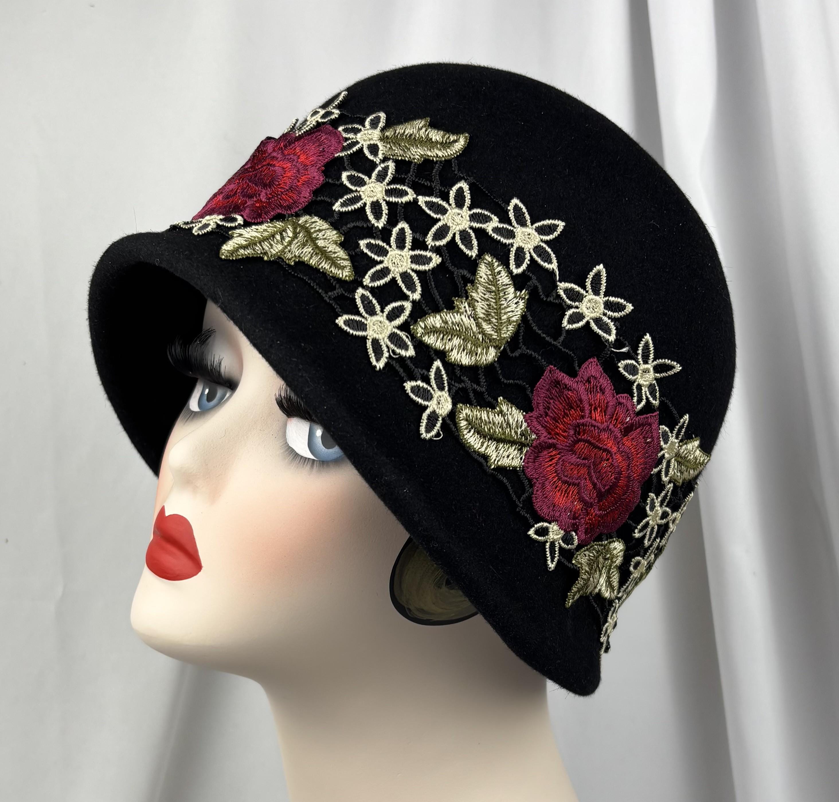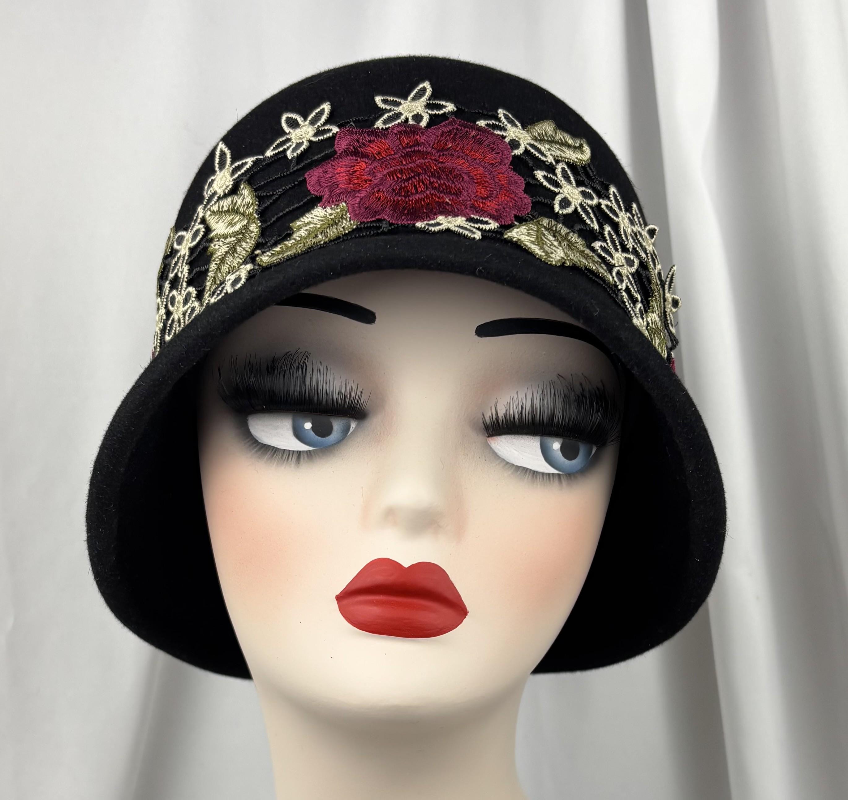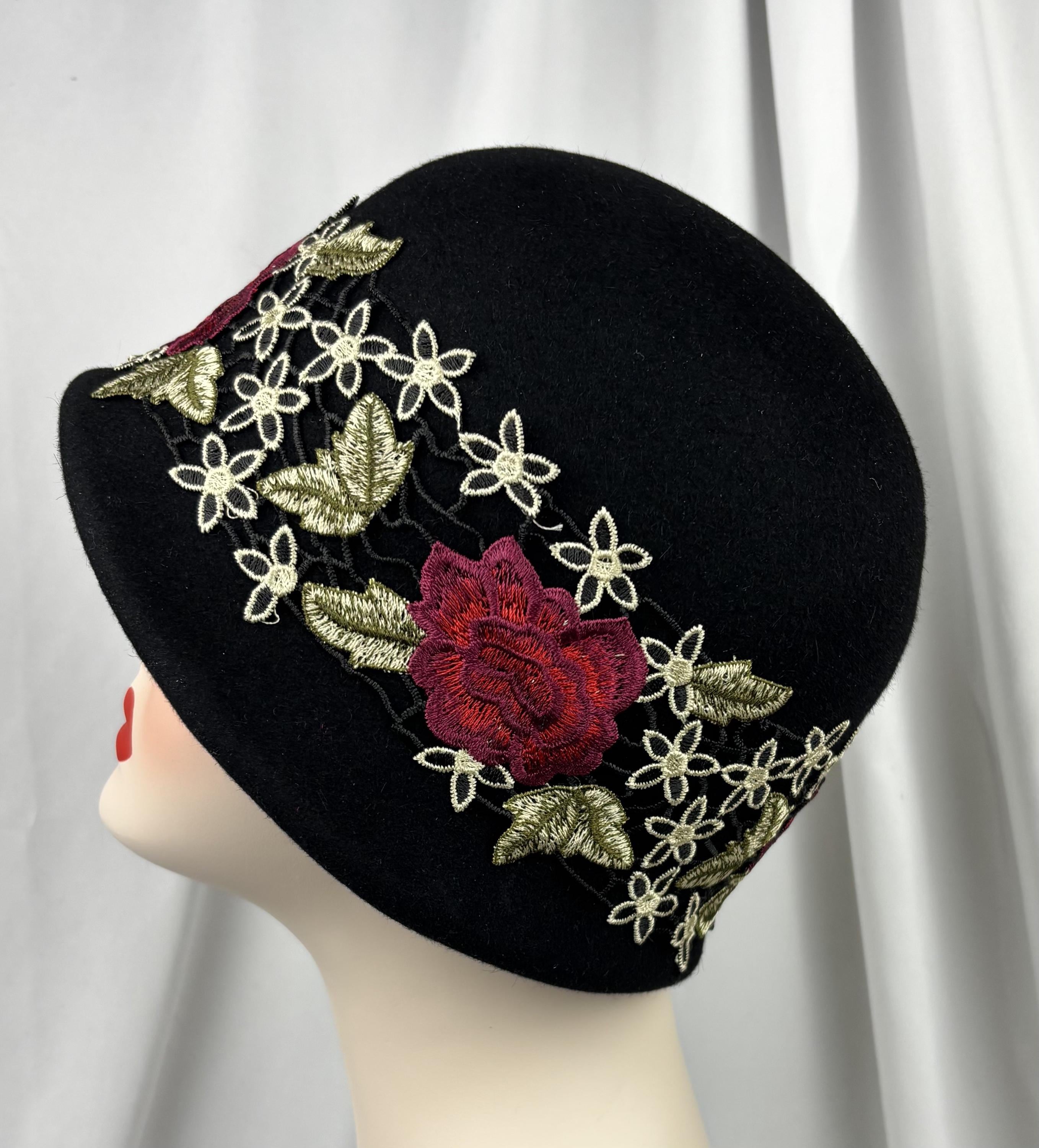 Black Felt Cloche, Embroidered Trim, 1920s Style, Handmade Millinery