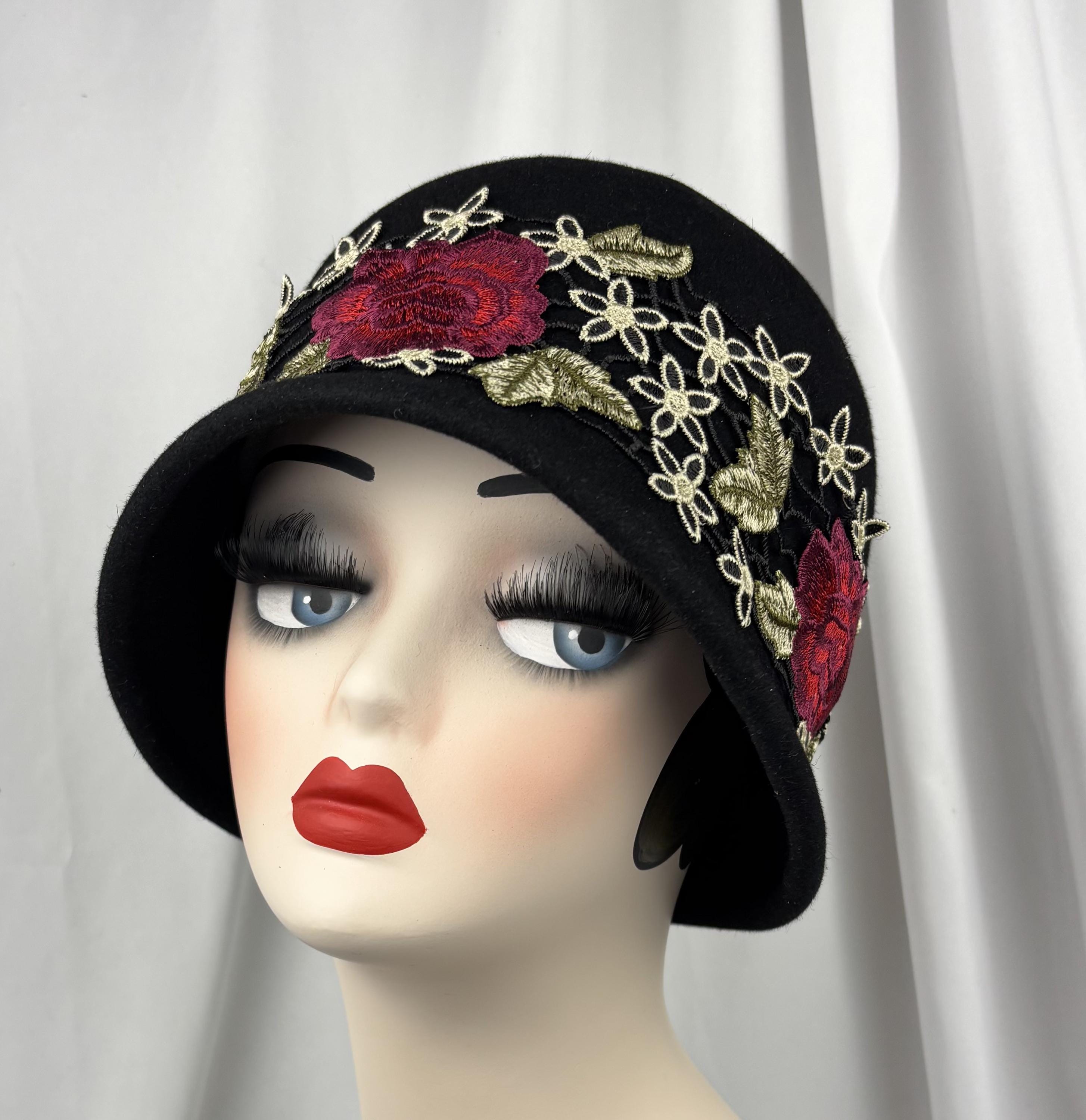 Romance is in the Air! An elegant fur felt cloche - 1920s Style- with an embroidered lace trim.